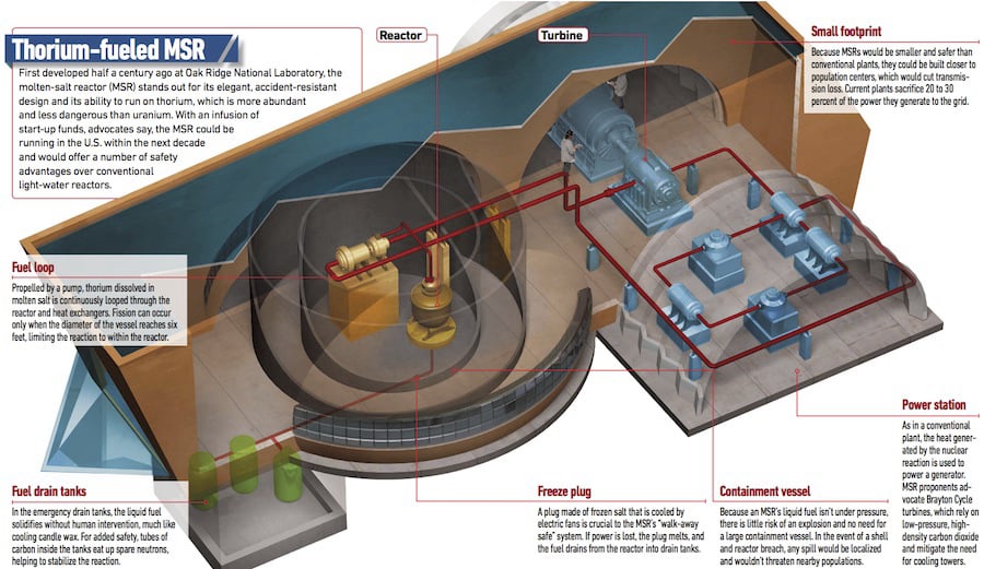 In an MSR, liquid thorium would replace the solid uranium fuel used in today’s plants, a change that would make meltdowns all but impossible.
