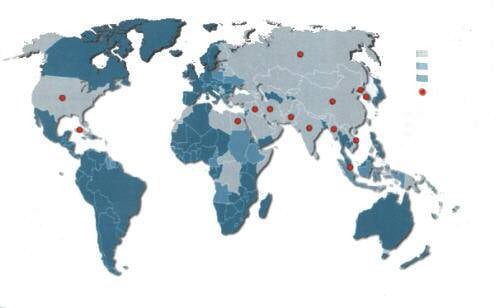 All the countries that have signed or agree in principle with the treaty to ban land mines are the countries in the darker blue colors. Note that most of the countries (light blue) that have not signed not signed the treaty or at least agree with it in principal are the ones still making land mines (the red dots).